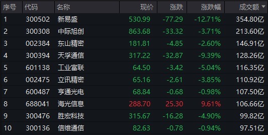 个股成交额方面,新易盛半日成交额超354亿元居首,中际旭创、东山精密、天孚通信等成交额靠前。